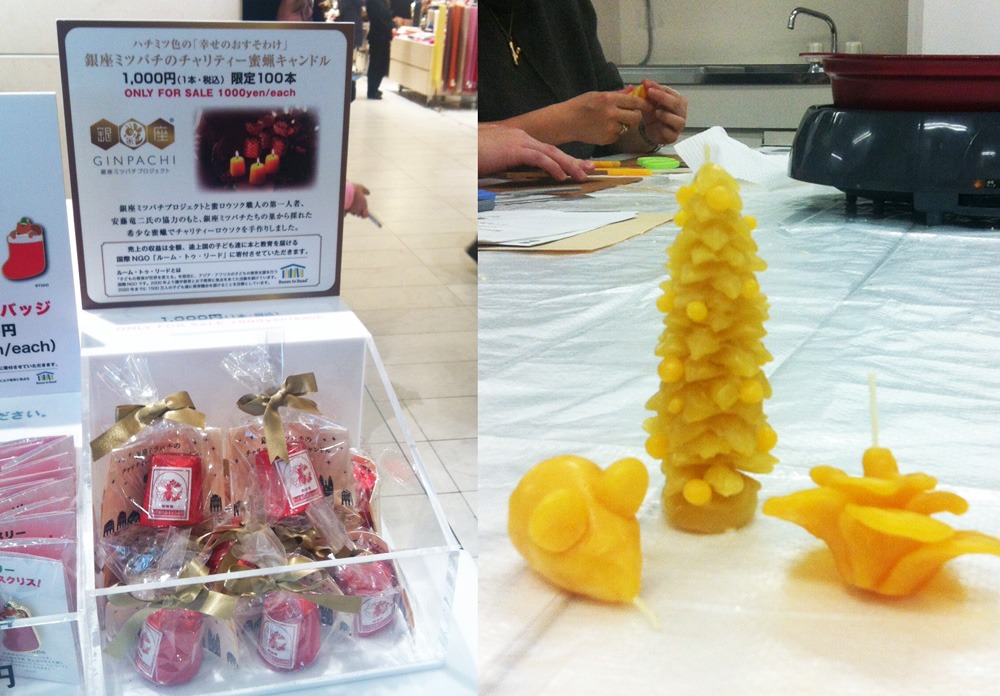 松屋銀座店さんにお呼びいただき、銀座で採れた蜜蝋でWSをしてきました。うちの蜜蝋も協賛して、大都会産と原生自然産のコラボ。銀座みつばちPJの養蜂家山本なお子さんから都心の蜜源や活動についてのお話も聞けました。ハチ蜜の森キャンドル製の銀座産チャリティー蜜蝋キャンドルも、正面入口で販売されていました! これは、だいぶ売れちゃったそうなのでお急ぎください😊