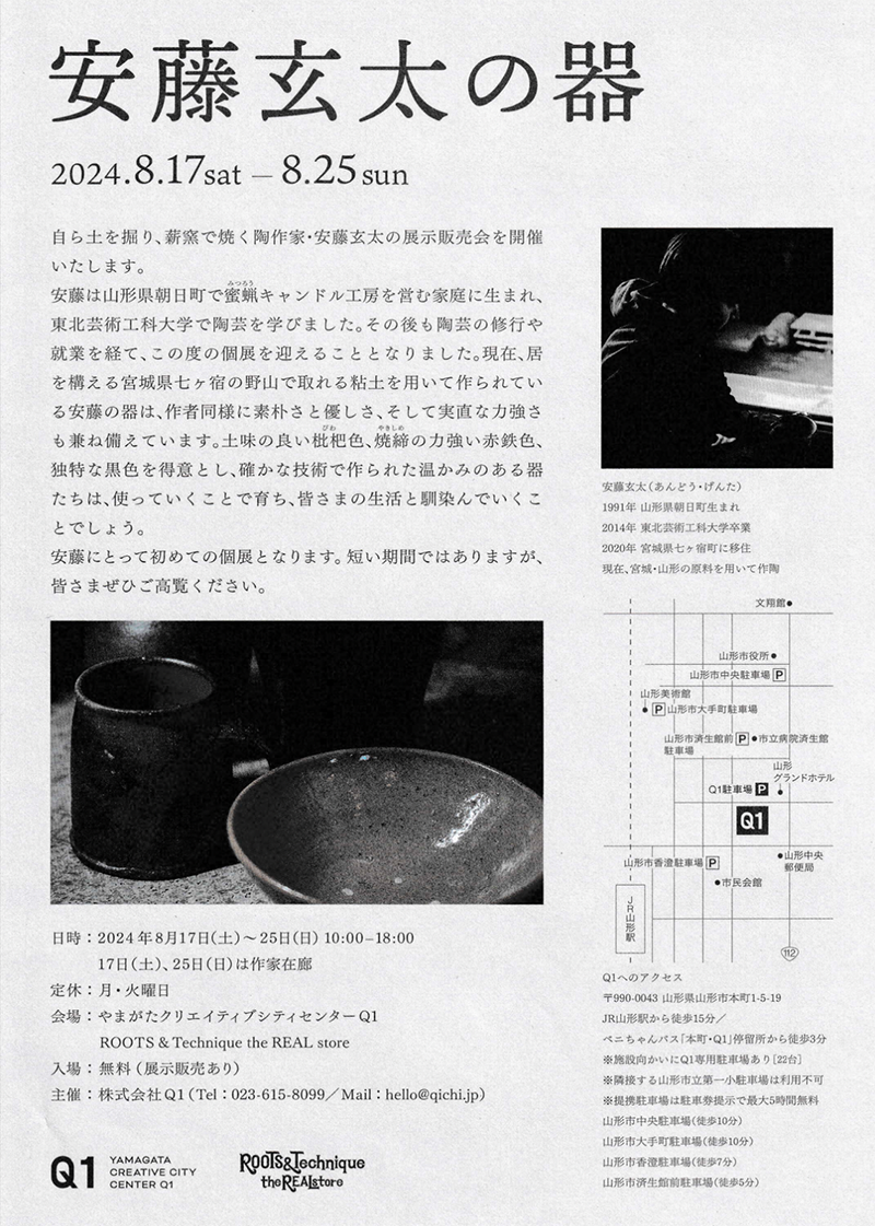 陶芸家をしている愚息 安藤玄太の初めての個展が今日から山形市のQ1(旧山形市第一小学校)で開かれます。