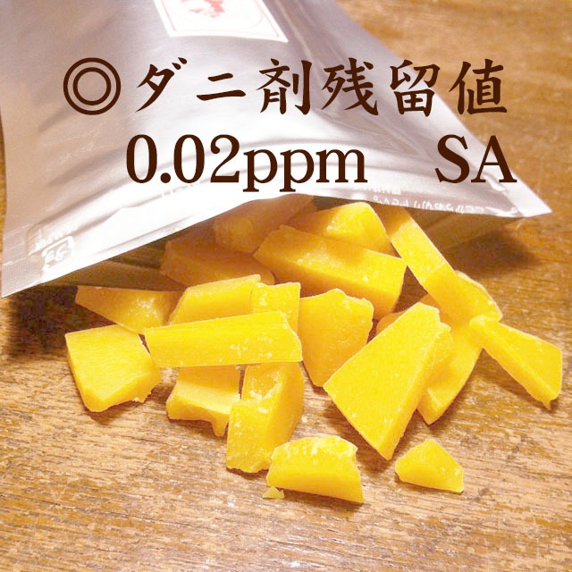 薬剤フルバリネートは私たちが普段食べている農産物にも使われています。たとえば、洗わずに食べることが多いイチゴでも0.7ppmまで散布が許されています。その値より低い値(概ね0.5ppm以下)の蜜蝋を「Sタイプ」として販売しています。検査を重ねるとこの値でも貴重なことがわかりました。どうぞご理解いただき、「SAタイプ」も「Sタイプ」もご愛用いただけましたら幸いです。