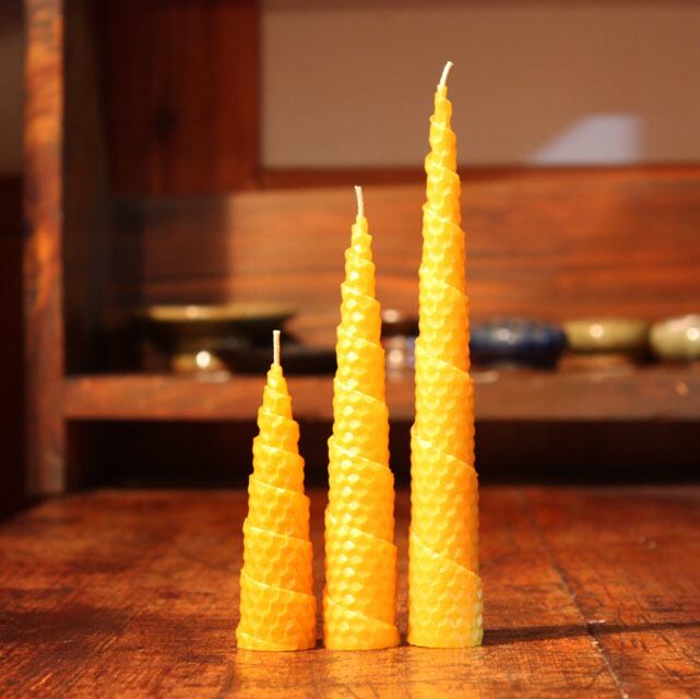 実寸のミツバチの巣柄にプレスした蜜ろうのシートを、芯糸にくるくると巻き付けたロール式のキャンドルです。灯すとハチの巣模様が透けて見え、まるで巣の中のハチミツが灯っているようです。