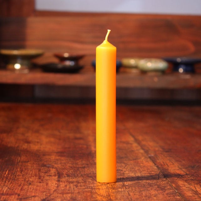 写真の色と異なる場合がありますが、きれいな黄色またはオレンジ色の蜜ろうで製作しています。ただ、天然色のため時間とともに退色します。お早めにお使いください。