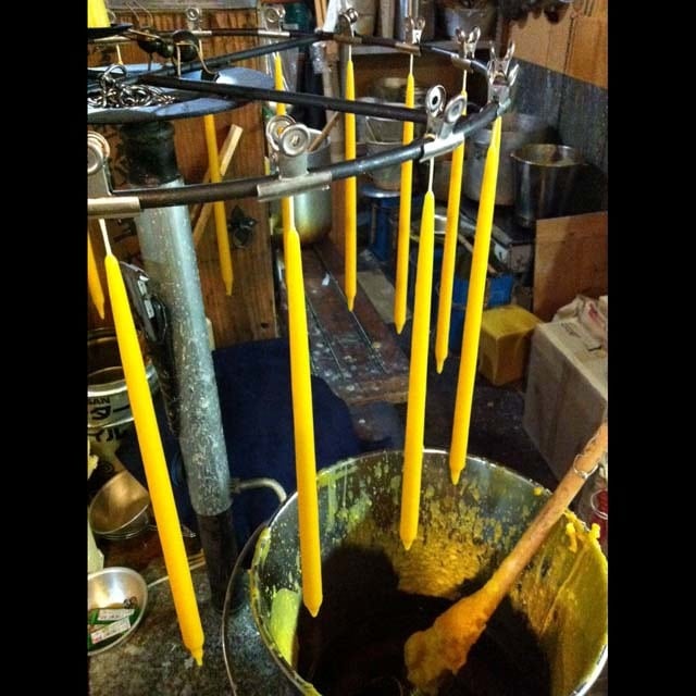 溶かしたロウに芯糸を何度も浸けこんで太らせる「ディッピング」や、ぶら下げた芯糸に何度もロウをかけて太らす「ろう掛け」の方法で作っていますので、どのようなサイズもご用命いただければ製作いたしております。現在は、大きな教会用に70センチサイズも定期的にお作りしております。ただし、20cm以下のサイズはは30本、25cm以上のサイズは10本以上の注文からたまわります。