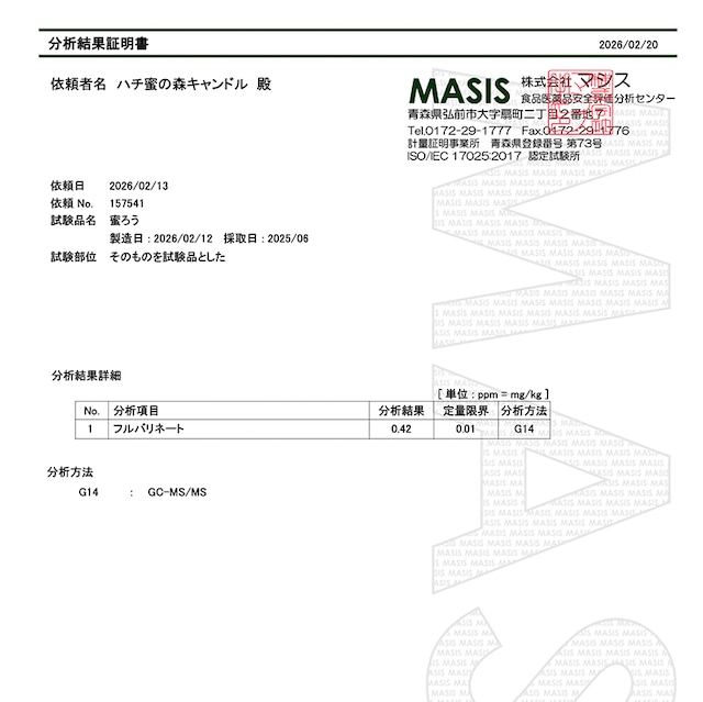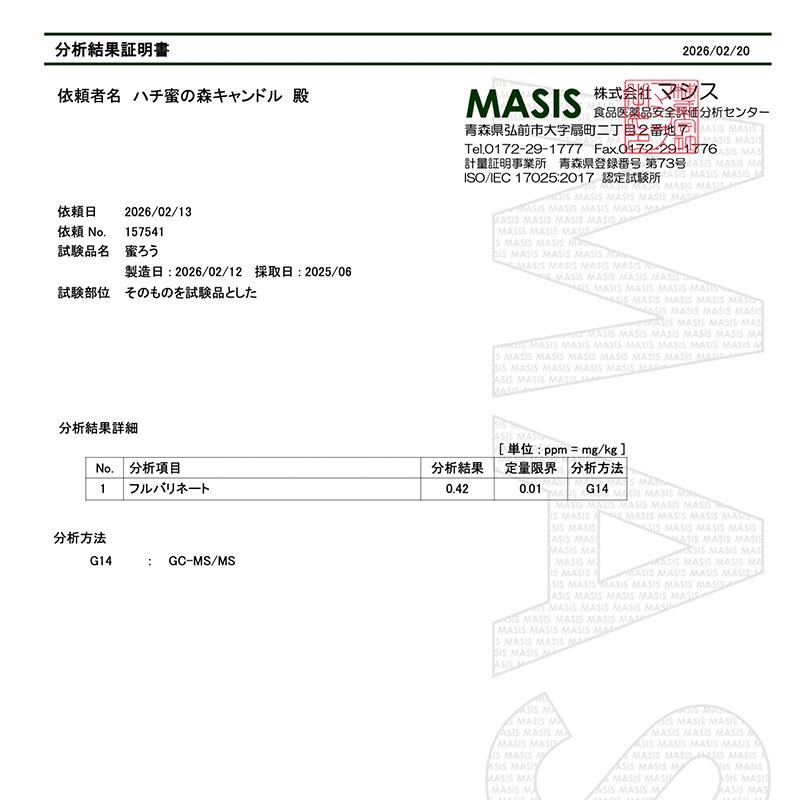 しかし、その新鮮なフタの蜜ろうといえども、深く切ってしまえば、残留している古巣が混じってしまうおそれがあります。そこで、ハンドクリームやお菓子用の蜜ろうは、残留薬剤の有無を山形県理化学分析センターで検査してもらい、不検出もしくは残留値の低い蜜ろうを販売することにいたしました。