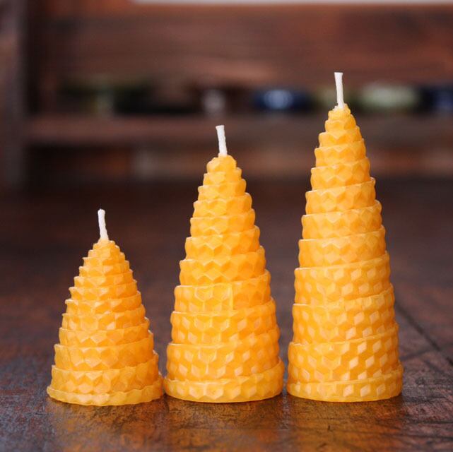 かわいらしい円すい形の大中小セット。実寸のミツバチの巣柄にプレスした蜜ろうのシートを、芯糸にくるくると巻き付けていますので、灯すとハチの巣模様が透けて見え、まるで巣の中のハチミツが灯っているようです。