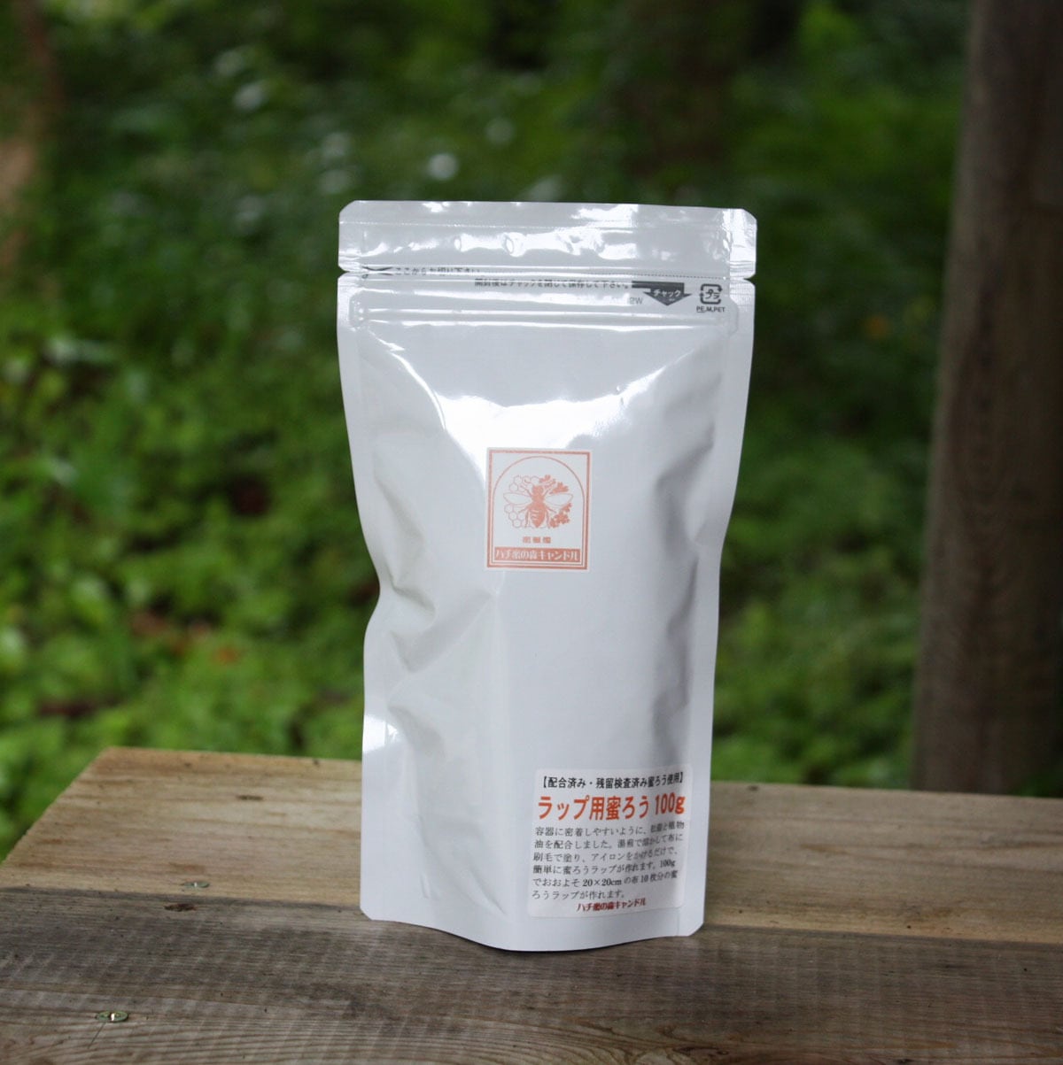 多くのお客様からのリクエストにお応えして蜜ろうラップ用の配合済み蜜ろうの販売を始めました。容器に密着しやすいように蜜ろうに松脂と植物油を配合しました。湯煎で溶かして刷毛で塗りアイロンをかけるだけで、誰でもとても簡単に蜜ろうラップが作れます。また、食品に使うものなので、養蜂で使用するダニ剤残留検査済みの蜜ろうSタイプを使用しています。布の厚さにより異なりますが、100gでおおよそ20×20cmの布10枚分の蜜ろうラップが作れます。