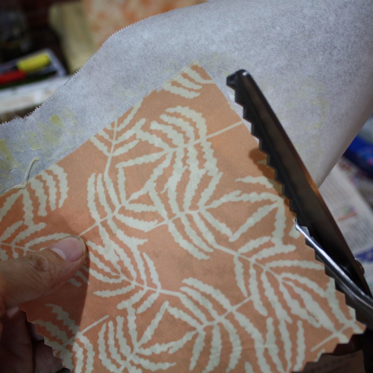 9.冷めたら粘着力が増すように、布の端をピンキングはさみでギザギザにカットしてできあがり。