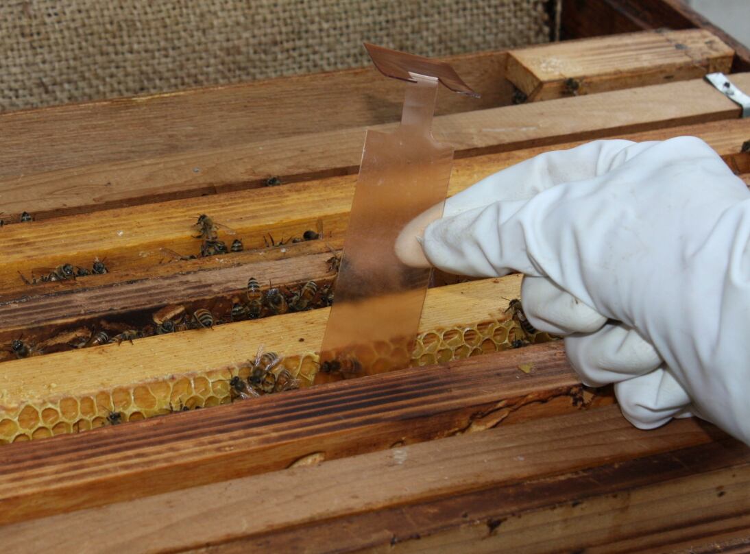 また、養蜂業では、採蜜の終わった秋になると、ミツバチの身体に寄生するダニを、巣内に薬剤をぶら下げて落とす作業があります。ミツバチの健康を考えると必要不可欠な作業ですが、その薬剤の「フルバリネート」は、脂溶性のため蜜ろうに大変残留しやすい性質を持っています。ダニ剤が残留しているのは巣枠の古い巣の部分です。