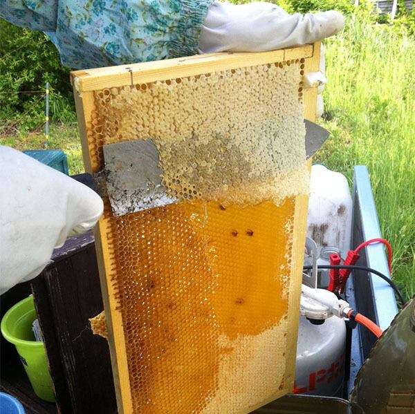 採蜜の時は、たくさんハチミツを蓄えさせるために、巣枠と巣枠の間隔を広げて、巣を盛り上げさせ巣穴を深く作らせます。巣穴が蜜で満タンになると新鮮な蜜ろうでフタをします。採蜜の際はこのフタを切り取って遠心分離機に入れます。ハチ蜜の森キャンドルの蜜ろうは、おもにこのフタの部分の蜜ろうです。蜂蜜の収穫は1週間〜10日に一度行いますから分泌したばかりの新鮮な蜜蝋といえます。
