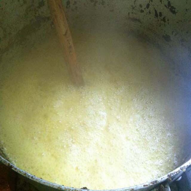 ①作りたい量の蜜ろうと植物オイルを小鍋に入れ湯せんで溶かします。おすすめの比率は、蜜ろう1:オイル4です。ですから、たとえば50gのクリームを作るとしたら、10gの蜜ろうに40gのオイルを入れます。